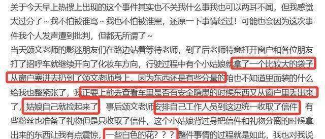 这里面就有不少让人觉得奇怪的地方。就说这个剧组人员力挺的内容吧,他说张颂文扔的不是信件,是个比较大的白色袋子,还直接扔到张颂文身上了,东西有一定重量。可又说粉丝自己捡起来了,不是乱扔在道路上。这就有点矛盾了,到底是不是很重的东西呢?如果真的很重,粉丝还能这么淡定地捡起来?而且他说事后张颂文了解情况后做了补救措施,安排工作人员统一收信件,粉丝也没生气,还把信件和礼物分开,礼物是白色的花。这白色的花和信件,怎么想都不像是很有分量的东西啊,之前说有一定重量,还怀疑有安全隐患要去车里查看,这不是自相矛盾吗?这就像一个人先说这个苹果很大很重,后面又说这个苹果轻得像羽毛一样,让人不得不怀疑这里面是不是有什么猫腻。